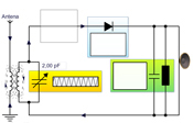 Struktūrinė schema, akcentuojami pagrindiniai elementai, jų funkcijos, signalo kitimas. Galima keisti kondensatoriaus talpą. Vaizdžiai parodomi procesai antenoje, virpesių kontūre (akcentuojamas rezonanso momentas);