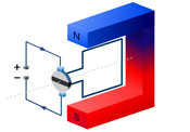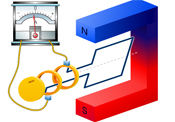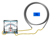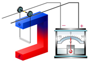 Laidas, kurį galima judinti, magnetiniame lauke. Prijungtas galvanometras.