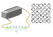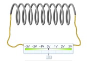 Laidų vija, kuria teka elektros srovė (srovės kryptį, stiprį, vijų skaičių galima keisti), magnetinės indukcijos linijos. Vaizdą galima pasukti 180° kampu;
