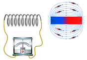Ritė su prijungtu galvanometru. Nuolatinis magnetas (su pavaizduotomis magnetinės indukcijos linijomis) juda ritės atžvilgiu (greitį galima pakeisti). Judant magnetui, ritėje indukuojasi srovė (rodyklytės ant ritės laidų), juda galvanometro rodyklės. Priklausomai nuo magneto judėjimo krypties, rodoma indukuotosios srovės kryptis bei jos sukurto magnetinio lauko indukcijos linijos. Aiškinama Lenco taisyklė.