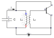 Virpesių kontūras prijungtas prie maitinimo šaltinio per triodą (tranzistorių) ir ritę. Aiškiai parodomos srovių kryptys, magnetinės indukcijos linijos apie rites.