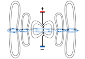 Vaizdą galima pasukti 90 laipsnių. Stebimas bandymas su aiškiai iliustruotomis srovės kryptimis bei magnetinėmis indukcijos linijomis. Iliustruojant elektromagnetinės indukcijos dėsnį, akcentuojamos sūkurinio elektrinio lauko linijos.